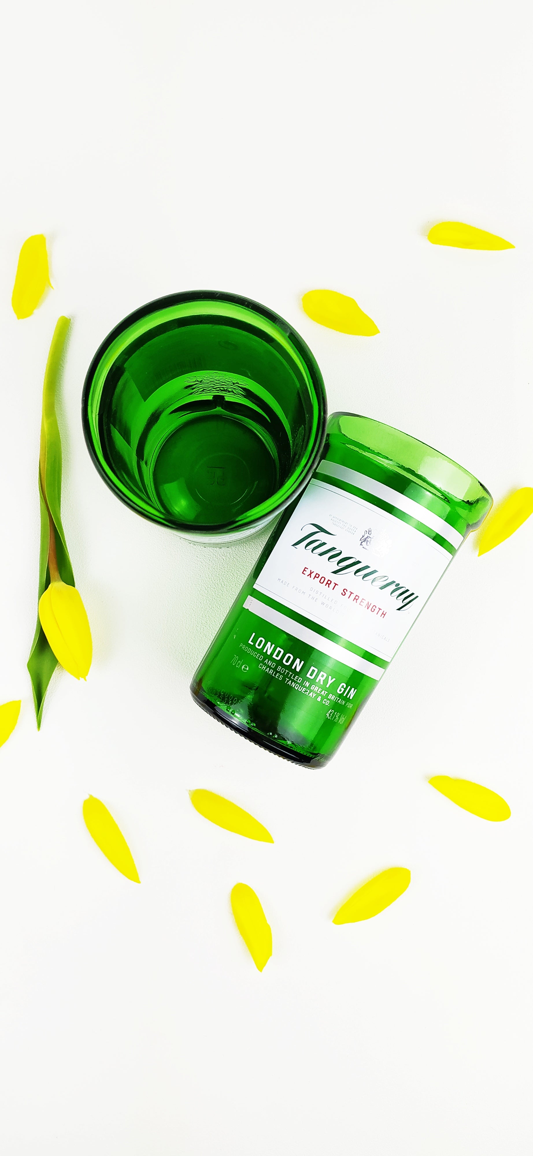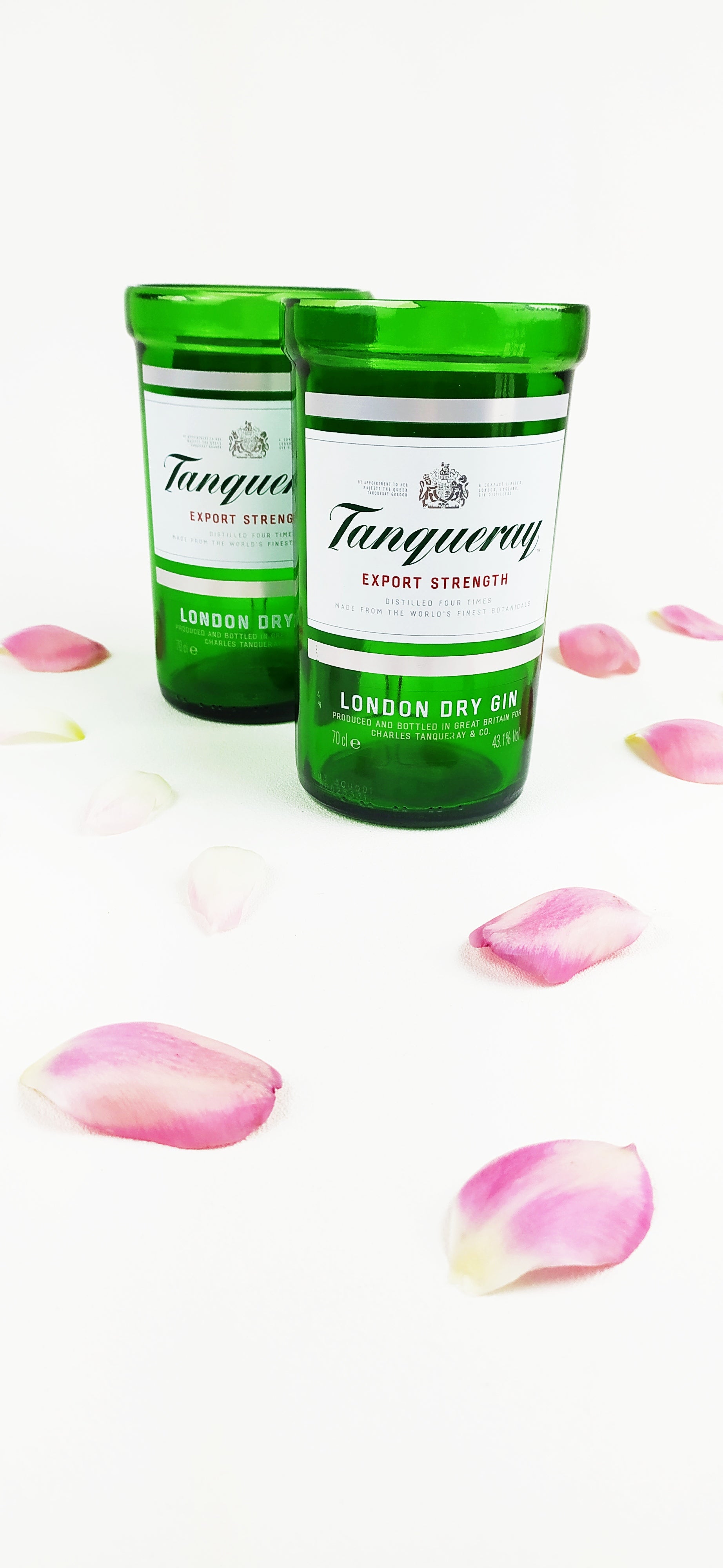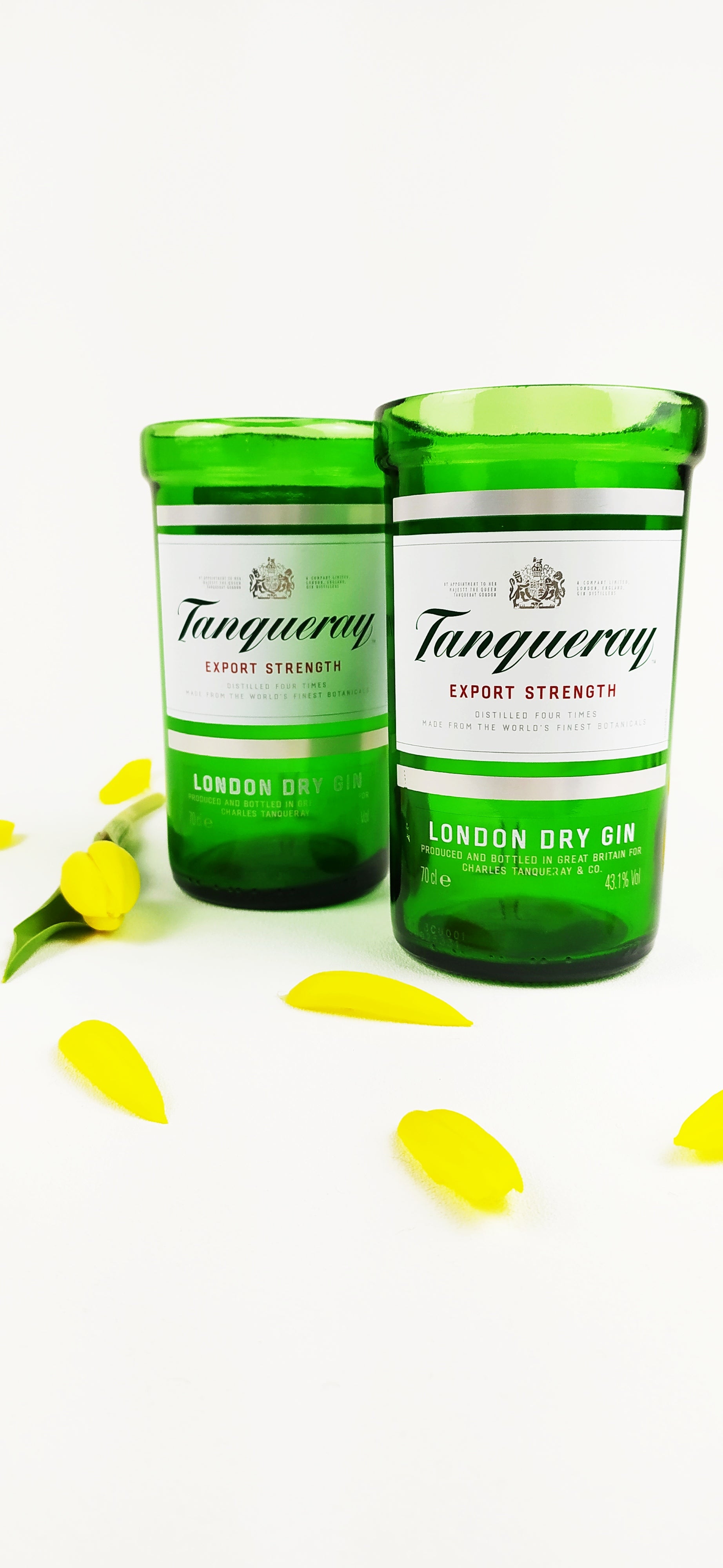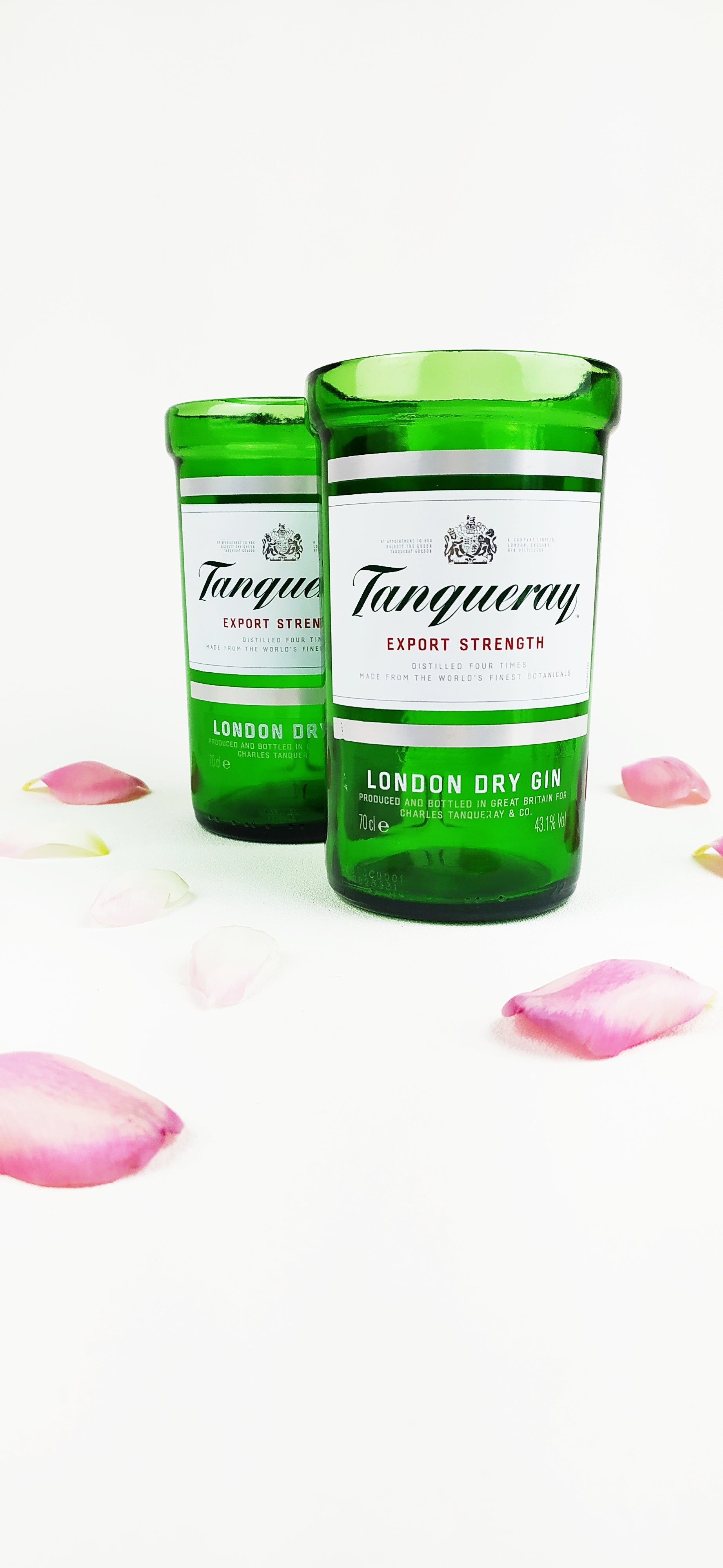 Bicchieri realizzati da bottiglie di Tanq. Gin