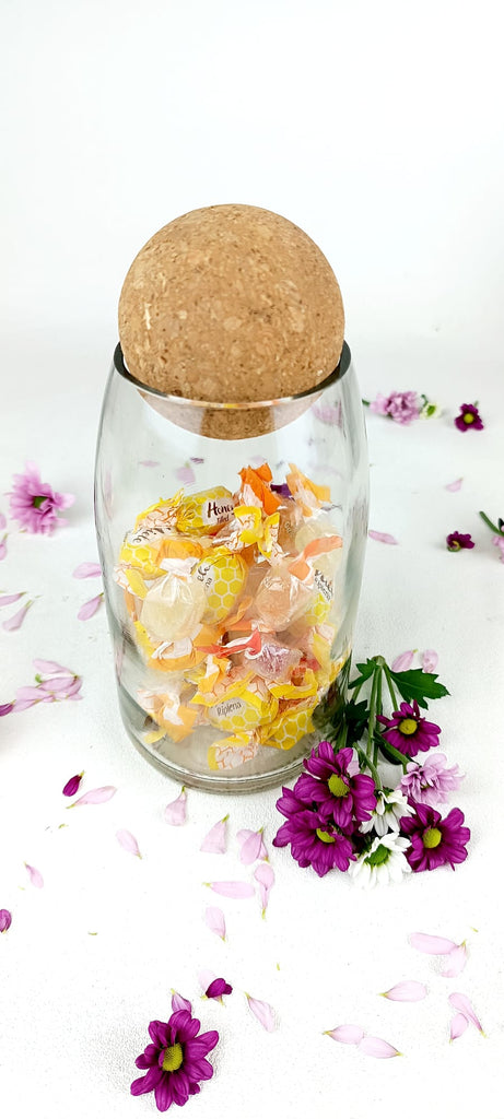 Contenitore trasparente realizzato con bottiglia di vino trasparente e tappo rotondo in sughero.
