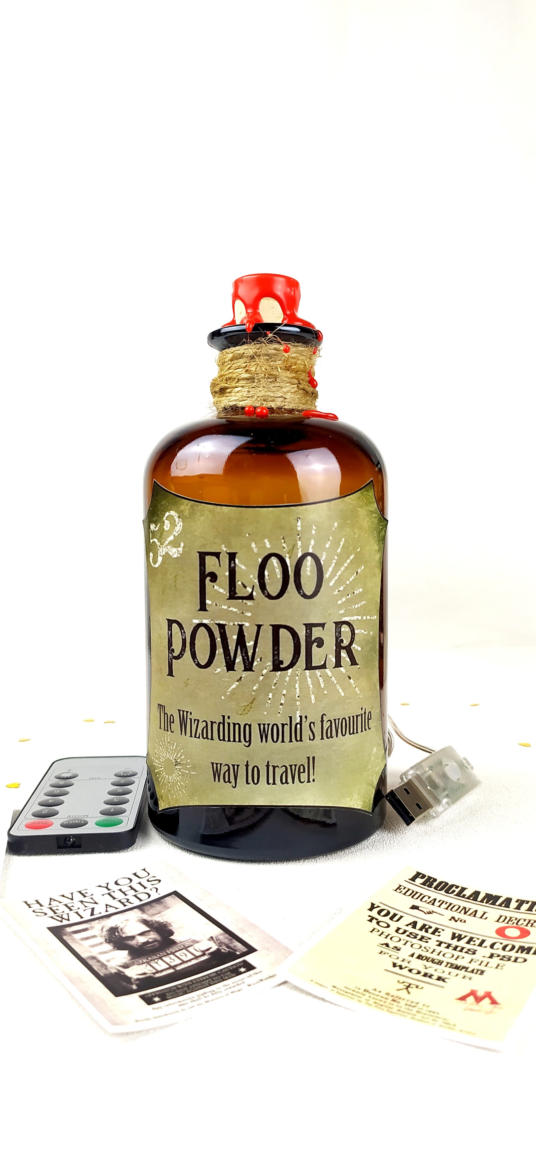 La bottiglia è stata forata, rietichettata e decorata con corda e ceralacca.